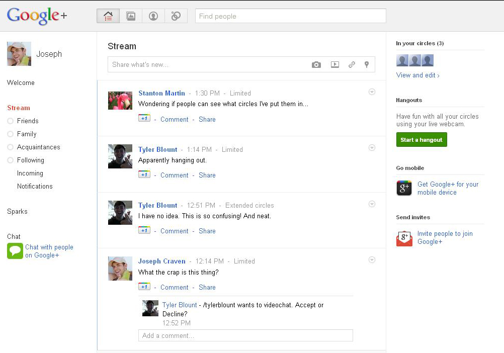 All I knew about Google+ is that it involved seeing people’s faces when you chat with them and putting your friends in circles. Therefore, it was identical to real life.